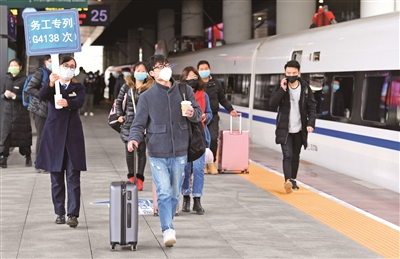 2月16日,全国铁路定制务工人员返程专列从贵阳北站开出,近300名贵州籍务工人员乘车前往杭州市。据悉,在全力防控新冠肺炎疫情的同时,各地企业也在逐渐复工复产。为了既满足企业用工需求,又降低返程运输的疫情传播风险,浙江省杭州市对疫情相对平稳,前往杭州就业人员较为集中的贵州、四川等部分省市申请开行外地务工人员“一站式”抵达专列。乘客进站统一测量体温、列车上“隔排隔座”,保证人员安全。图为工作人员引导返程务工人员上车。 新华社发