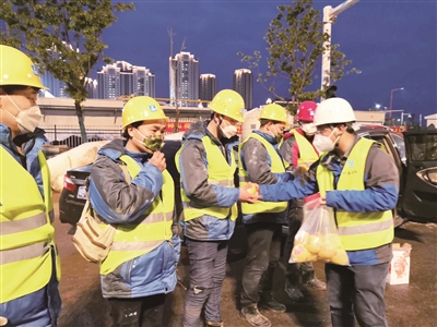 2月8日,“此时的场面像不像战争大片中吹响冲锋号的时刻?!真是一场史无前例的大会战!今天是一个特殊的元宵节,一个令人难忘的元宵节!广大农民工战士还在雷神山医院抢工,不能陪伴亲人左右。条件有限,提供不了元宵给工人,特地购置了苹果,寓意着平平安安。还有牛奶,给工人补充补充营养!”
