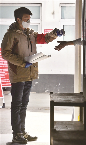 “测体温,手消下毒,领完新口罩旧口罩扔这里啊。人和人距离不要小于1米,互相站远点……”昨天上午8点多钟,在地铁12号线第十合同段,务工人员们正一个个间隔1米排队,等着在检测后开始施工作业。