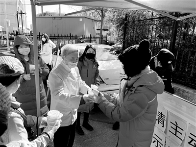 在第57个全国“学雷锋纪念日”来临之际,北京华天集团所属多家老字号企业弘扬雷锋精神、践行志愿服务,为西城区13个街道社区疫情防控一线人员送去超千杯暖心饮品。图为华天二友居的志愿者们把新制作的百合三豆饮送到西城区东椿树社区工作人员手里。