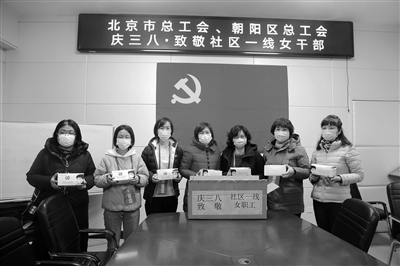 朝阳区总工会设立慰问防疫一线女职工专项资金,连同市温暖基金会拨付的经费,为全区43个街道、地区的社区(村)一线女职工近8000人购买一次性医用口罩。3月8日,朝阳区总工会党组常务副书记、常务副主席姬文革带队,赴团结湖、麦子店、六里屯等地的社区进行慰问,为一线女职工们送去市、区两级工会组织的温暖,还会同区委组织部慰问在抗疫一线连续加班突发脑溢血的社区女社工,为其送去2万元慰问金,并持续关注。
