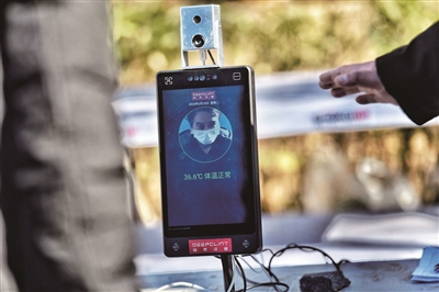 “请您配合测量体温,出示出入证。”3月8日,在望京西园四区北门,物业工作人员用手指向旁边桌子上放置的一台机器。居民只需站在机器前方一米左右的位置,将脸部对准屏幕,机器上端的红外测温仪就会自动检测出额部温度,并用语音播报出来。同时,温度也会显示在屏幕上,并记录在系统内。