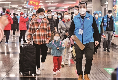 3月25日17时43分,载有第一批离鄂返京人员的G488次列车驶入北京西站。下车后,北京西站开辟专门绿色通道,专人引导离鄂返京人员经由专用站台和出站口有序出站,他们将会跟随工作人员分别返回各区区级转运中心。