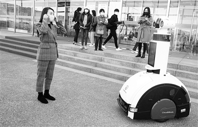 本报讯 (记者 陈艺) 昨天,在中关村延庆科技园区,一款“抗疫”机器人提示未戴口罩的路人要戴好口罩。