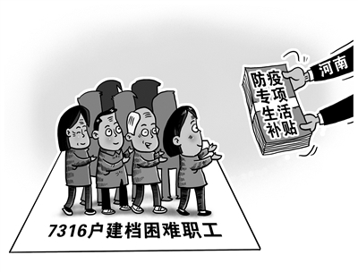 记者从河南省总工会获悉,为保障疫情期间困难职工生活需求,河南省总工会将按照每户2000元标准,为全省7316户建档困难职工发放防疫专项生活补贴1463.2万元。(4月5日 新华社)□朱慧卿