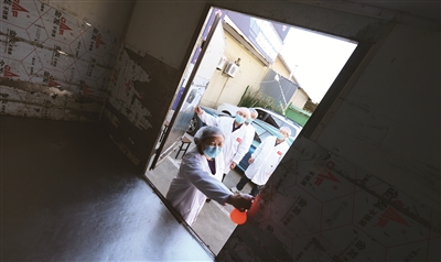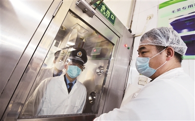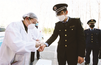3月17日,记者跟随顺义区市场监管局执法人员走进中铁快餐公司。大门口专门设了岗,正在为即将上岗的职工进行测温、消毒。