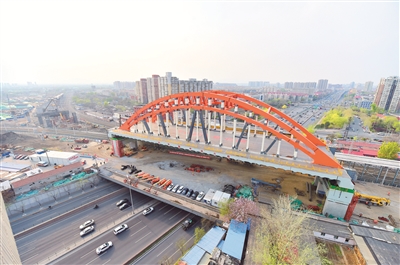4月9日16时16分,随着桥下千斤顶缓缓启动,丰台特大桥精准地落在预定位置上,标志着丰台站改建工程再进一步。这座六线简支钢箱拱桥位于丰台区正阳桥的南侧,跨越了京沪铁路和西四环路。该桥长112米,桥宽38.6米,全桥总重5700吨,是丰台站改建全线贯通的控制性工程。