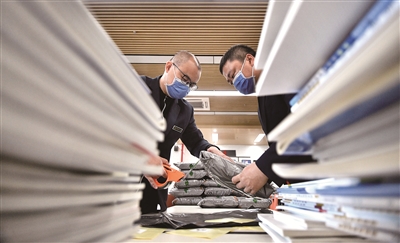 手套、胶带、塑料包装……教材收寄工作开展以来,双榆树支局从局长到一线全员上阵,每天工作超过12小时。4月9日,朱巍与同事已在中关村中学忙了两天,从天亮到晚上八九点钟,将初二到高二1300多份学生教材和200多份老师教辅教材进行寄递。当天发出的教材,基本上第二天就可以收到。