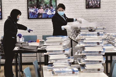 朱巍是海淀邮政分公司双榆树支局的局长。在中关村中学,朱巍和同事利索地将教材分拣处理,并用塑料薄膜和包装袋双层包装,再贴上“学生教材寄递请优先处理”标签。之后,在单独区域消毒操作,保证干净整洁,再由营业部进行消毒处理后,进行寄递。