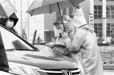 4月20日,在绥芬河市入城口,工作人员在雨中坚守岗位。当日,黑龙江省绥芬河市迎来降温降雨天气,防疫工作者在雨中坚守岗位。