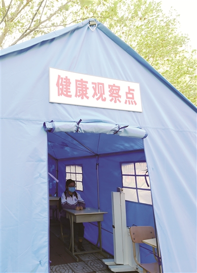 突然,红外测温仪发出警报,原来有一名“学生”体温监测“异常”。工作人员立刻指引她前往校门一侧的“二次测温”临时观察点,进行腋下体温监测。“间隔10分钟,测两次。”校医刘秀敏介绍,如果体温监测正常后,学生可前往教室上课;若体温依然异常,则要在隔壁的“健康观察点”等候,期间校医会详细询问学生14天的行程,并由老师及时联系家长,如有可疑将由120接往定点医院进一步排查。
