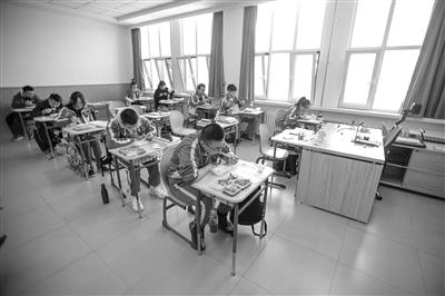 4月27日,北京市高三年级学生开学复课。为了保障学生和教职工的食品安全,丰台区市场监督管理局的工作人员来到北京中桥外国语学校,对学校的接餐、餐品发放和学生就餐情况进行现场检查。记者注意到,在学生用餐时,学校通过教室分散就餐等方式确保学生就餐间距在1.5米左右。本报记者 周美玉 彭程 摄影报道