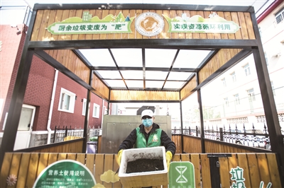 自5月1日起,《北京市生活垃圾管理条例》将全面实施,各地将垃圾分类纳入日常管理。记者昨天在海淀区学院路街道二里庄社区看到,一名垃圾分类志愿者将厨余垃圾倒入厨余资源化一体机内,在经过分解、压缩、发酵等步骤后,短短两个小时垃圾即可“蜕变”为养育植物的营养土。