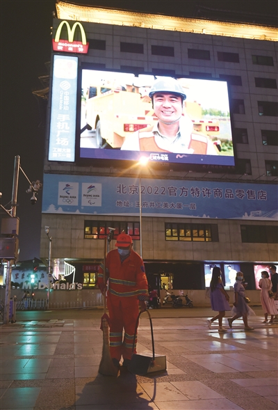 5月3日20时49分,王府井工美大厦楼体外的户外大屏上,以“北京劳动者之歌——微笑传温暖 心语寄深情”为主题的3分钟短视频正在播放,吸引了过往人们的驻足,也不乏有正在工作的环卫工人和交通辅警。“我在这里扫了17年的地,从前几年开始,每年‘五一’,大屏上都会播放属于我们平凡劳动者的片子。”说话的正是王府井环卫中心的环卫工人王师傅,他喜欢把长安街以北——王府井步行街以南的200米路东侧,称为他的“地盘”,“现如今,大家的素质提高了许多,我这身上背着的垃圾桶,一天都装不满。今年提倡垃圾分类以后,大家更加注意保护环境了。”王师傅说。
