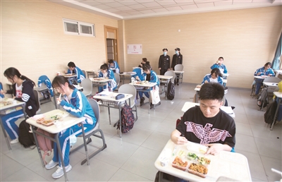 在经过层层把关和记录后,工人们迅速将热气腾腾的营养配餐装进保温箱,由专门的配送人员和车辆送往学校。跟随着送餐车辆,记者和执法人员来到中桥外国语学校,对学校的接餐、餐品发放和学生就餐情况进行查看。学校通过教室分散就餐等方式保证学生就餐间距在1.5米左右。