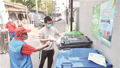 5月1日起,新修订的《北京市生活垃圾管理条例》正式实施。北京市东城区建国门街道作为市级垃圾分类示范片区,正以多种方式向居民推广垃圾分类措施,践行垃圾分类理念。图为垃圾分类志愿者(左前)指导居民将分类后的垃圾丢入桶中。