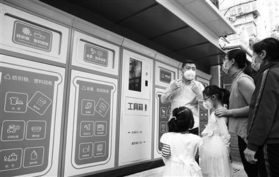 记者在小南庄社区里看到,一个长4米,宽0.5米,高1.5米的垃圾智能分类箱正式投用。社区垃圾志愿者在活动现场教起了社区居民由他们自编的垃圾分类“三句半”:“生活垃圾有立法,分成四类不复杂。厨余、有害、可回收,其他!剩饭剩菜、瓜果皮、茶叶糕点火锅底,这些垃圾算一类——厨余!竹木、瓷片、破抹布,手纸、毛发、烟屁股,其他垃圾还有啥?大棒骨!”听着形象生动的垃圾分类“三句半”,居民顿时感到分类垃圾容易多了。
