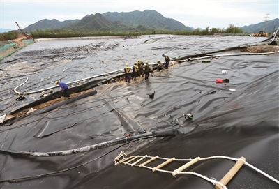 在紧挨着首创环境公司的小张家口垃圾卫生填埋场,正在进行二期扩容施工,这里是延庆区两个填埋场之一。运到这里的垃圾经过摊平、压实,再用高密度聚乙烯膜覆盖住。