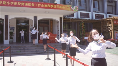 其实,这并不是真正的突发状况,而是东城区举行的2020年春季学期基础教育返校复课准备工作全流程演练(小学专场)活动。演练呈现了学生在校学习生活的真实情境,按照工作流程和相关预案,对“入校检查、体温筛查、进入教学区、应急处置、晨检、上课、课间、就餐、午检、放学”等环节进行实景演练。