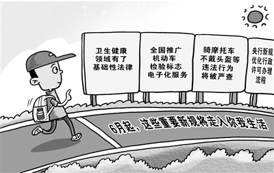 6月的新风,送来了法治新气象。卫生健康领域“基本法”生效,让你我的生命健康更有制度保障;机动车检验标志实现全国范围内电子化服务,点点手机就能在线申领;道路千万条安全第一条,骑摩托车不戴头盔、坐汽车不系安全带等交通违法行为要被严查了……你的衣食住行,由法治来守护。(5月30日 新华社)□朱慧卿