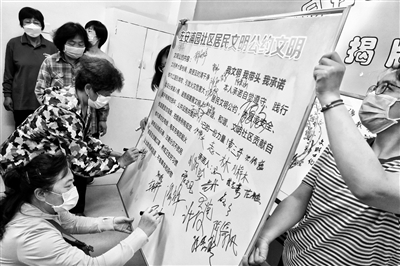“文明养犬要拴绳,粪便及时清干净;楼内过道别堆物,引发火灾危害大;高空抛物太危险,砸到行人需担责……”5月27日,东城区龙潭街道左安浦园社区“文明公约”揭牌仪式正式启动,居民展示了自己以“文明公约”为主题创作的书画作品,表达自己做一名文明居民的决心。