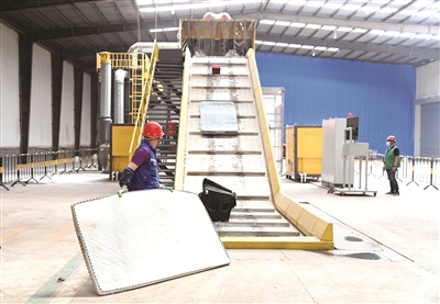 6月3日,在海淀区再生资源回收分拣加工中心,工作人员(前)将分解后的废旧床垫放入自动化破碎设备。近日,记者来到海淀区西北旺镇的海淀区再生资源回收分拣加工中心,了解废旧沙发、床垫等大件垃圾处理程序。据了解,大件垃圾到达分拣加工中心后,工作人员对其简单分解后,再通过大件垃圾自动化破碎设备进行处理,每小时可处理大件垃圾110余件。新华社发