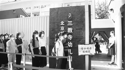 从6月8日起,本市满足防控条件的幼儿园可以陆续开园。复园后的幼儿园布置与以往相比有何不同?家长接送孩子有何要求?6月3日,首批复园的西城区三教寺幼儿园举行演练,6名幼儿教师扮成幼儿体验了复园全流程。
