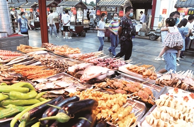 近日,河南省开封市鼓楼夜市在关闭4个月后恢复开放。近200个摊位整齐排开,各色小吃琳琅满目,烹炒的火苗、蒸腾的热气、不绝于耳的叫卖声……古色古香的广场上重现欢腾的烟火气。 新华社发