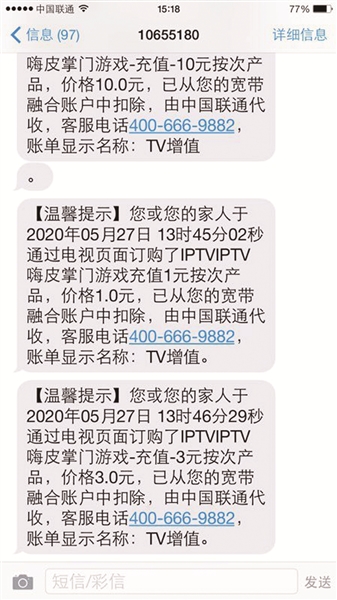 若不是看到备用手机上的短信,李女士还不知道孩子已经通过联通机顶盒购买了七笔付费业务。“近10天之内,花了近70块钱,可问题是付款前我没有收到任何的验证信息。”李女士说。对此,联通客服表示,购买机顶盒的付费业务属于快捷支付且无需验证。