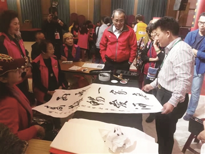 陈国华:作为一名书家,又是首都艺术家志愿者,我始终践行习近平总书记在文艺座谈会的讲话精神,深入生活,扎根人民。我要到人民中去, 弘扬爱国、爱党、爱人民的主旋律和正能量。笔墨当随时代,艺术为人民服务,为人民抒写、为人民抒情,为人民抒怀。我体会到通过参加走基层活动,与职工群众手挽手、心连心、面对面的交流,我自身也受益匪浅,不仅提炼了自己学术素养,也为丰富自已的书法创作,收集了丰富的创作素材。我作为书家,要把传承传颂中国传统的文化,包括书法这一高雅的艺术,尽自己的力量传承好,这是我多年来,对书法艺术执着追求的一份情怀!