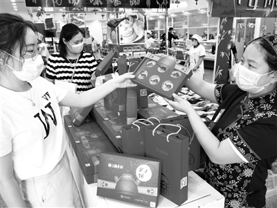 淡黄色饼皮上印有头戴红色状元帽的小状元图案、寓意“蟾宫折桂”和“好事连连”的桂花莲藕馅料……随着中高考临近,北京稻香村消失几年的状元饼又回来了。据稻香村负责人介绍,“状元饼”上市第一天就销售了近600盒,受到了消费者的热捧。本报记者 孙妍 摄影报道