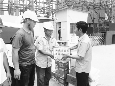 本报讯(记者 曹海英)进入6月以来,持续35摄氏度以上的高温来袭。为确保一线施工人员的身心健康,北京建工一建公司工会迅速行动起来,购买了绿豆、白糖、饮枓以及清凉油、十滴水、风油精等防暑降温用品,在公司党委书记张英甫,党委副书记、工会主席孙阳带领下,深入各在施工程开展暑期送清凉走访慰问活动。