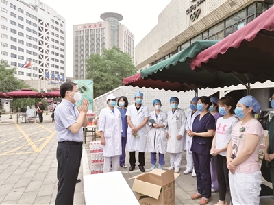 6月23日,区委卫生健康工委书记、卫生健康委主任王建辉、调研员宫汝津来到和平里医院、第六医院、隆福医院、鼓楼医院等检测点,慰问了现场医务人员,叮嘱大家做好个人防护、保重身体,感谢大家的辛苦付出,感谢他们为疫情防控工作作出的贡献,鼓励大家勠力同心,坚决打赢这场攻坚战。