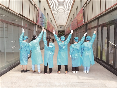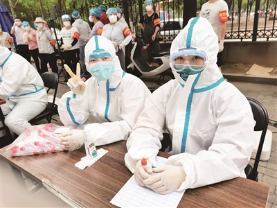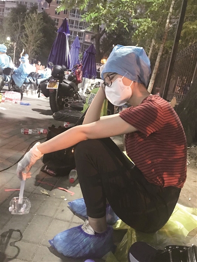 “说实话穿着防护服又闷又热,闷得喘不过气。”在风险等级最高的花乡地区,医保局职工王丁身着防护服,眼带护目镜,协助花乡刘孟家园社区做核酸检测登记工作,高温暴晒,护目镜很快就布满雾气,防护服里的衣服也早已湿透,紧紧贴在身上,“我们负责核对做核酸检测的居民的身份证信息、电话,再把核酸检测条码贴在登记册和试剂瓶上,然后引导居民去检测台……我记得有一天做了2400多人,第二次是为小区300多名居家隔离人员做二次核酸检测,虽然很辛苦,但是很有成就感。”王丁说。短短半个月,王丁赢得了社区群众和社工们的认可与称赞。