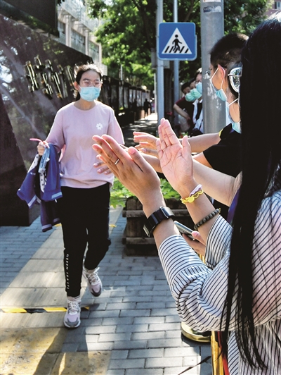八一学校的高三送考教师站成一排,手举“自信满满 高考必胜”“要想考的好 就要开心笑”“八一加油”等自制的标语牌,为本校学生应援。除了老师外,该校学生会还组织了几个高一高二学生前来,为师兄师姐打气。高二女生袁畅说,学校一直有高考送考的传统,“看到今天的大场面,我也有一点紧张。今年形势特殊,是对高三考生的一大挑战,但我相信他们的实力,一定能考出好成绩。有了今天的体验,相信自己明年也可以。”