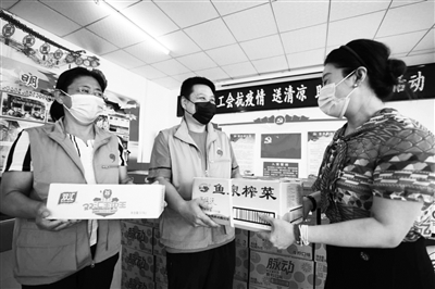丰台区总工会上周走访慰问南苑街道防疫一线职工,对坚守在“疫”线工作岗位上的社区工作者及工会志愿者的敬业精神给予赞扬,并送上防疫物资。同时嘱咐大家要注意保护好自身安全,加强自我防护。本报记者 陈艺
