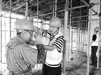 日前,浙江海盐县武原街道的专职网格员在走访辖区一建筑工地时,发现有工人没按规定戴好安全帽,专职网格员进行耐心讲解和演示,提醒工人正确佩戴安全帽。(7月13日《浙江工人日报》)
