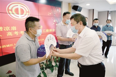近日,西城区人力社保局工会召开“手赠凉扇、爱心伴考”2020年中考、高考考生家长职工座谈会。区人力社保局党组书记彭随心参加座谈会,并为今年子女即将参加中考、高考的职工送上了“暖心伴考”应援包和手绘“金榜题名”“心想事成”等字样的凉扇,表达了对职工的关爱和对他们子女的美好祝愿。座谈会由区人力社保局工会副主席张宝玉主持。