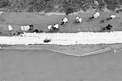 7月13日,在江西省九江市柴桑区江新洲的防洪大堤上,防汛人员在搬运沙袋加固堤坝(无人机照片)。受强降雨和上游来水影响,江西省九江市柴桑区江新洲水位持续上涨,当地镇村干部紧急投入抗洪抢险中。日前,江新洲江洲镇发出了《致江洲在外乡亲的一封信》,呼吁在外的父老乡亲返乡支援抗洪保卫家园。目前已有近三千名江洲儿女返回江洲,防汛队伍进一步壮大。 新华社发