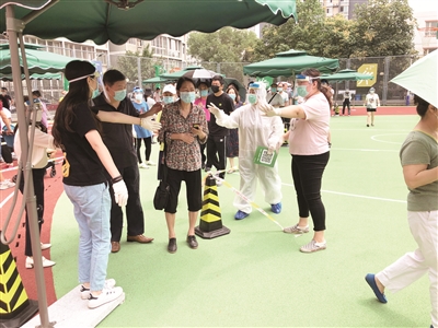 6月底,太平桥街道启动辖区范围内常住居民的核酸检测工作,工会服务站工作人员又扛起了核酸检测的任务,协助布置核酸检测现场,并在检测当日做好入场引导、扫码登记、秩序维护等工作。