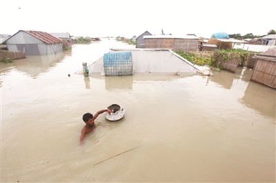 7月19日,在距离孟加拉国首都达卡100多公里的福里德布尔,当地居民的房屋淹没在洪水中。孟加拉国境内地势低洼,河流密布。每年6月至9月的季风雨季,洪涝灾害经常发生。 新华社发