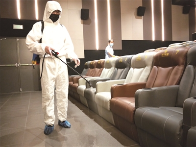 7月24日,北京市低风险地区的电影院将有序恢复开放营业。昨天,记者在苏宁影城了解到,观影采取网络实名预约,每场上座率不得超过30%,观众须全程佩戴口罩,观影期间原则上禁止吃零食。此外,影城聘请专业消杀人员对影院公共区域及各个放映厅进行全面消毒。