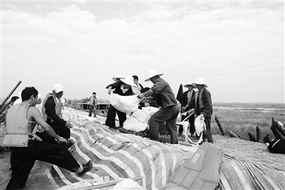 那年7月上旬,厂里从各个部门抽调人手轮流到河下泵房值班,24小时严密坚守,随时随地做好抗洪抢险准备。驻厂武警战士除了驻守油库和运煤铁道外也全部上了大堤。当时我在化验中心,化验中心几乎都是女同志,领导给我们分配的任务是给河下泵房的同事和坝上的驻厂武警战士送饭、绿豆汤和防暑降温药品。跟男同事相比,这个活儿是轻松的。我们每次到河下泵房后都让值班的同事歇口气、吃点东西补充体力,接过他们手中的铁锹、沙袋接着干,发扬了“巾帼不让须眉”的精神。