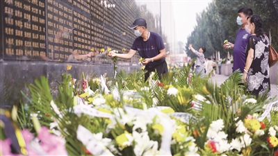 7月28日是唐山大地震44周年,许多市民来到唐山地震遗址纪念公园,在纪念墙前献上鲜花,祭奠遇难的亲人。图为市民在纪念墙前祭奠亲人。 新华社发