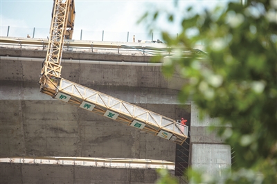 13时左右,骄阳把桥面、护栏晒得滚烫。为了减少占路作业时间,大家简单吃过午饭后,又开工了。只见张庆兴身上挂着几斤重的安全带,小心翼翼从检查梯往下爬,猫着腰到达挂篮,眼睛顺着手电筒在桥梁墩台面、支座部位进行扫描,并不时用检查锤敲打,仔细检查桥梁设备状况是否良好等。桥检车在桥上一点点挪动,桥下挂篮里的技术人员也一点点挪动。挂篮一直在轻微地晃动,桥板不时抖下一阵浮灰,脚下就是国道,但养护人员目不斜视、如履平地。几个桥墩检查下来,大伙儿的衣服早已被汗水浸透,豆大的汗珠顺着他的脸颊流淌,汗水滴入眼睛里火辣辣的疼。