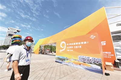 2020年中国国际服务贸易交易会将于9月上旬在北京召开,各项准备工作也已进入倒计时。本届服贸会展区占地面积约20万平方米,其中,室外展区位于奥林匹克公园公共区域,南起国家体育场南路,北至科荟南路,全长1.9公里。昨天,在奥林匹克公园景观大道南侧,装饰一新的室外展区迎宾门首次亮相。