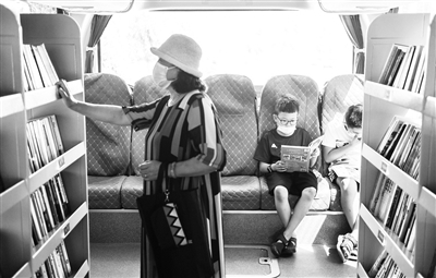 8月5日,长春市民在“流动图书馆”里看书。三千册图书,一辆大巴车,穿梭在城市的街头巷尾。在吉林长春,长春市图书馆利用流动图书车,定期在市内15个固定服务点间巡回流动,为市民提供便捷的图书借阅服务。 新华社发