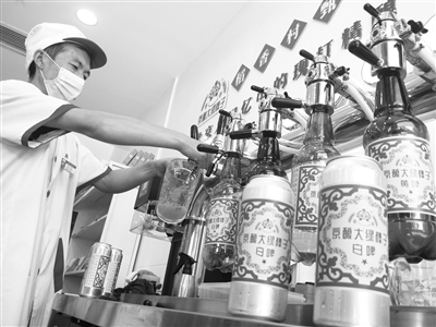 近日,北京稻香村部分门店上市了鲜啤酒。现打鲜啤酒是很多老北京人的记忆,老字号北京稻香村如今在部分门店开设了原浆精酿啤酒专柜。目前,提供白啤和黄啤两种口味,顾客可选择稻香村特别定制的怀旧瓶装和听装。本报记者 孙妍 摄影报道