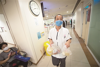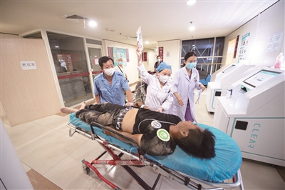 17时55分,值班“三线”的副主任医师杨军为患者完成了气管插管,可以继续上呼吸机。患者的呼吸恢复正常,全程弯腰救治患者的医师周海江的上半身衣服全湿透了,“弯着腰操作,腰会酸疼。”医师杨军扶着腰说,“今天我值24小时的班,随时处于待命状态。除颤仪‘嘀’一下就是一个心跳,如果出现问题声音会变得特别刺耳。急诊不知道接下来会发生什么,我们要随时做好准备。”