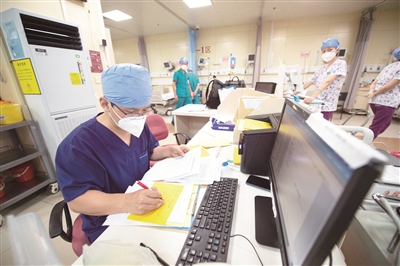 17日16时13分,北京朝阳医院急诊医学科内,外科手术室正在进行手术、候诊区转运患者的急救推车推过两辆、各个内科诊区的患者正在有序就诊。